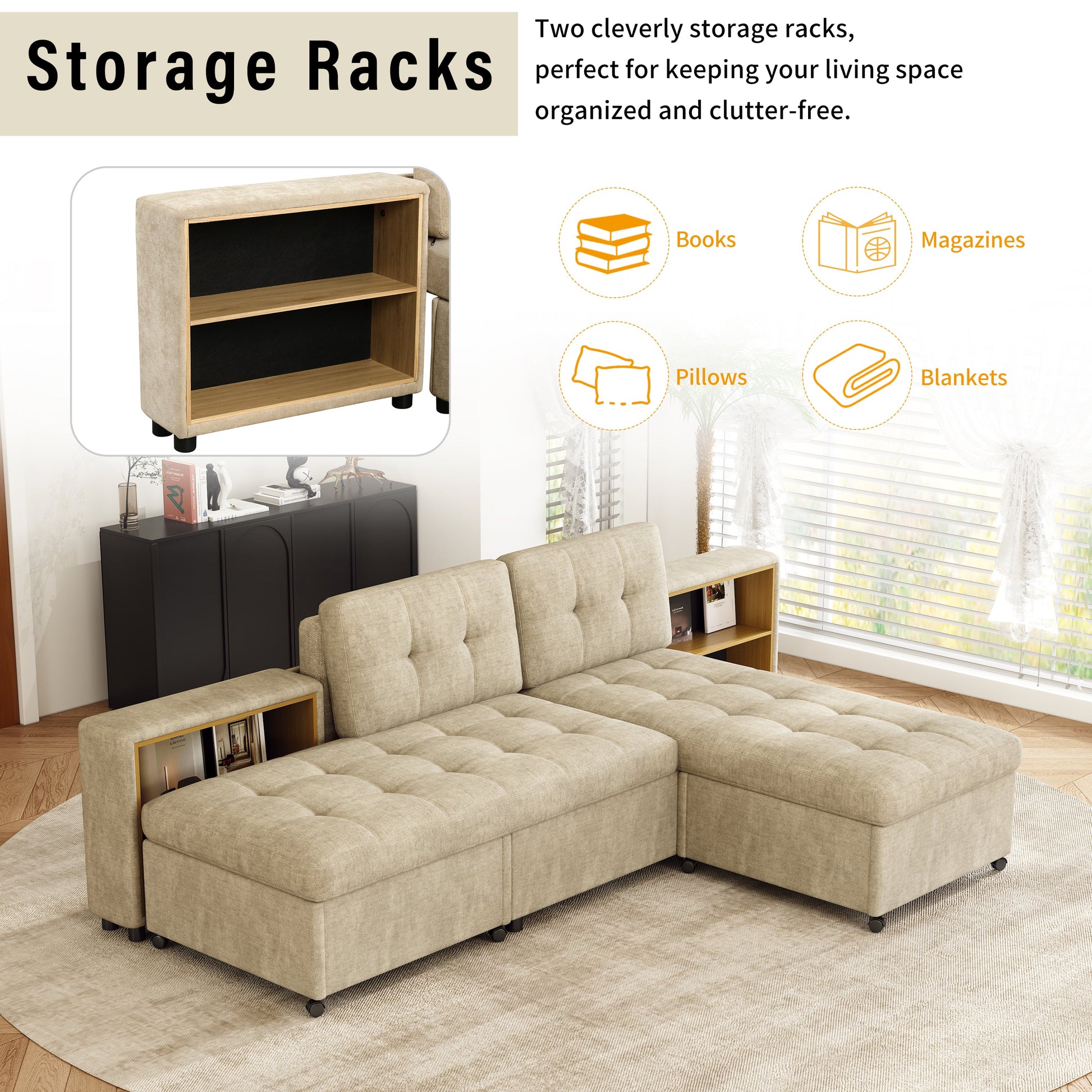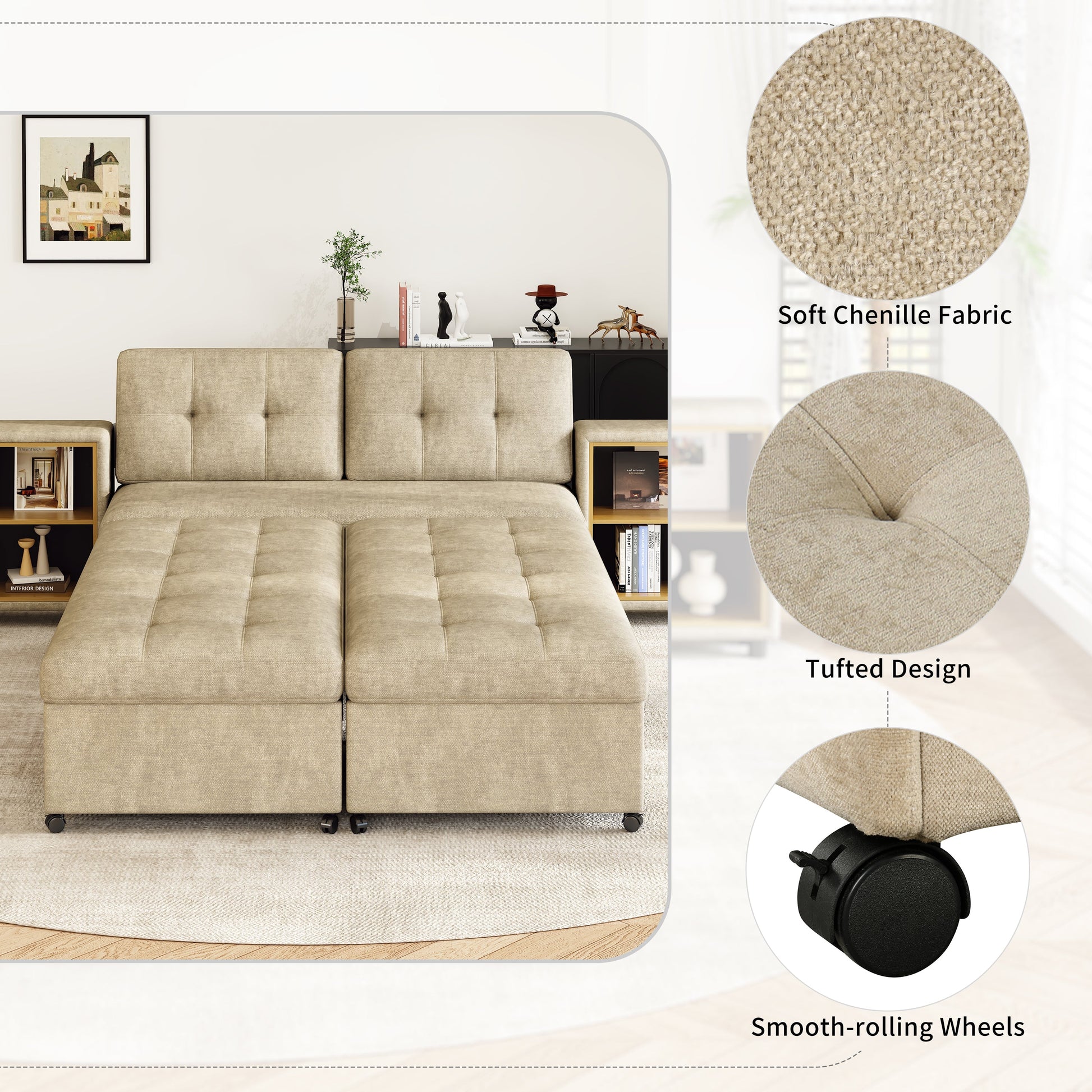 This versatile sofa combines flexibility, style, and functionality, making it an ideal addition to any home. With its modular design, it can easily be transformed into a sofa bed, L-shaped seating, or a spacious 4-seater configuration, adapting to various room sizes and needs. Equipped with two convenient storage racks, it helps keep your space organized while maintaining a sleek appearance. Upholstered in luxurious chenille fabric, it offers both comfort and durability, while being easy to maintain. Its space-saving design, sturdy construction, and smooth-rolling wheels ensure it’s perfect for multi-functional spaces, providing both practicality and style for daily use.