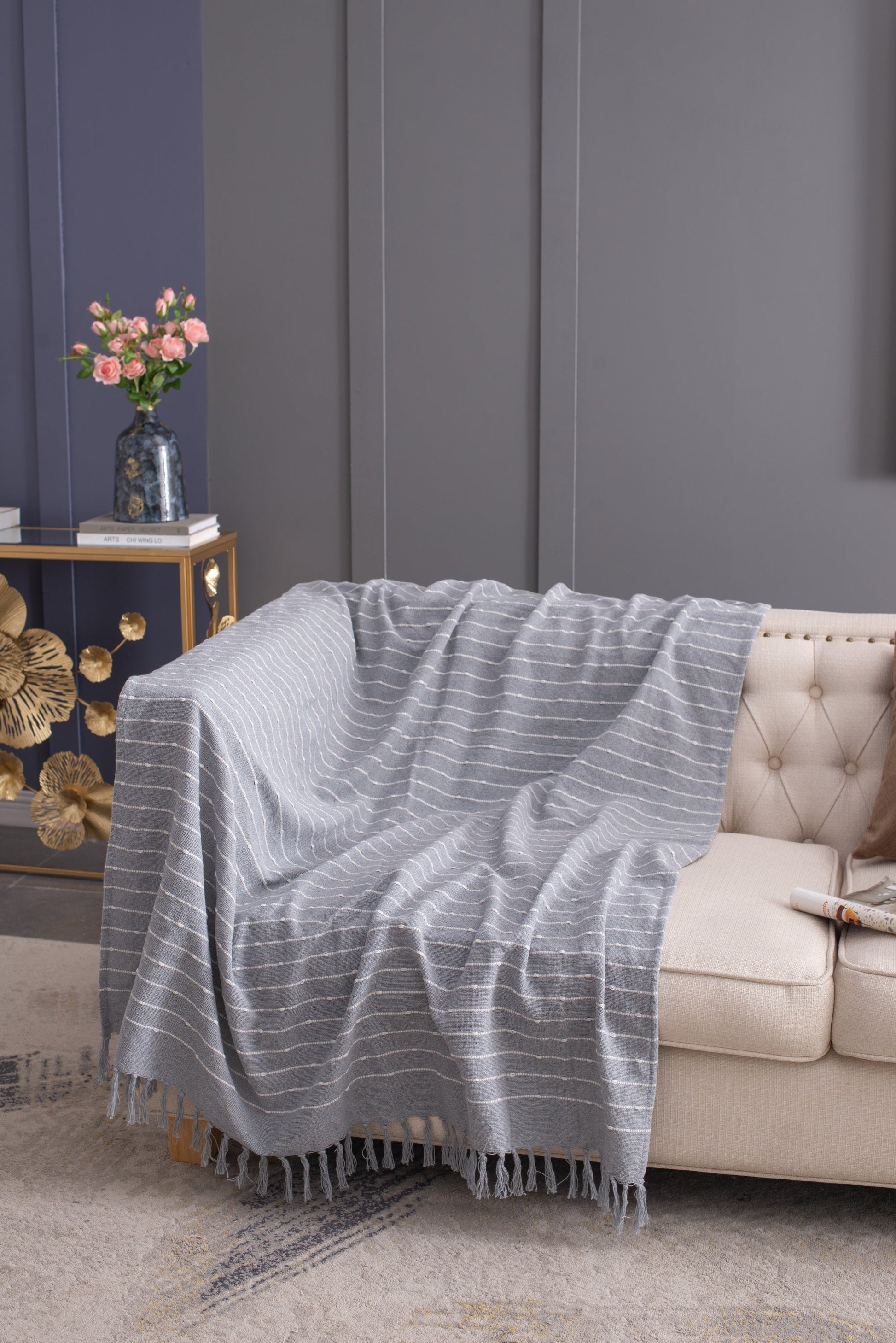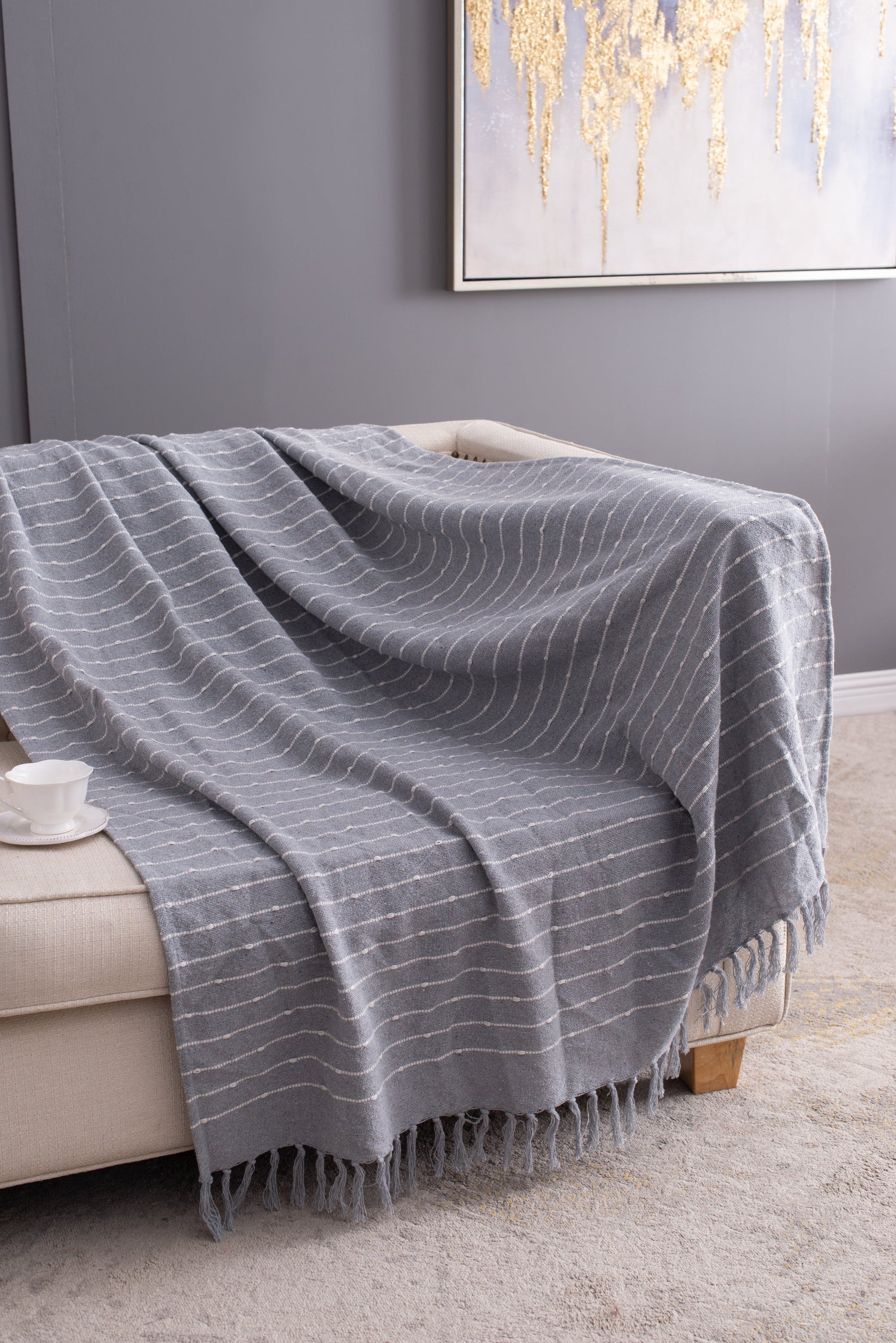 - Measuring 50W x 60L, this decorative throw blanket features a strong gray hue, muted white stripes, and tassels.