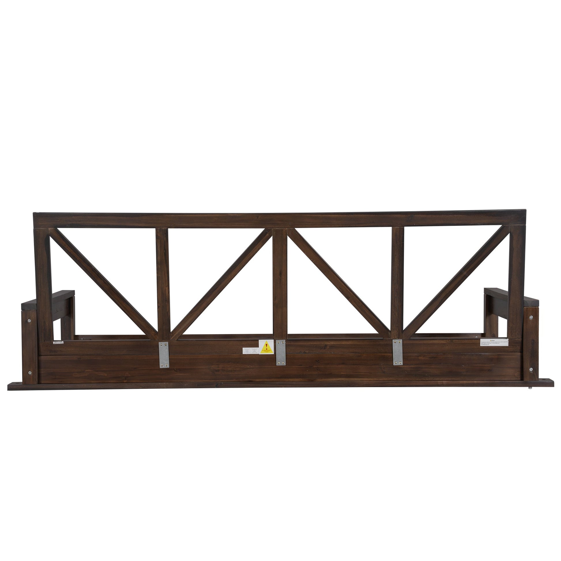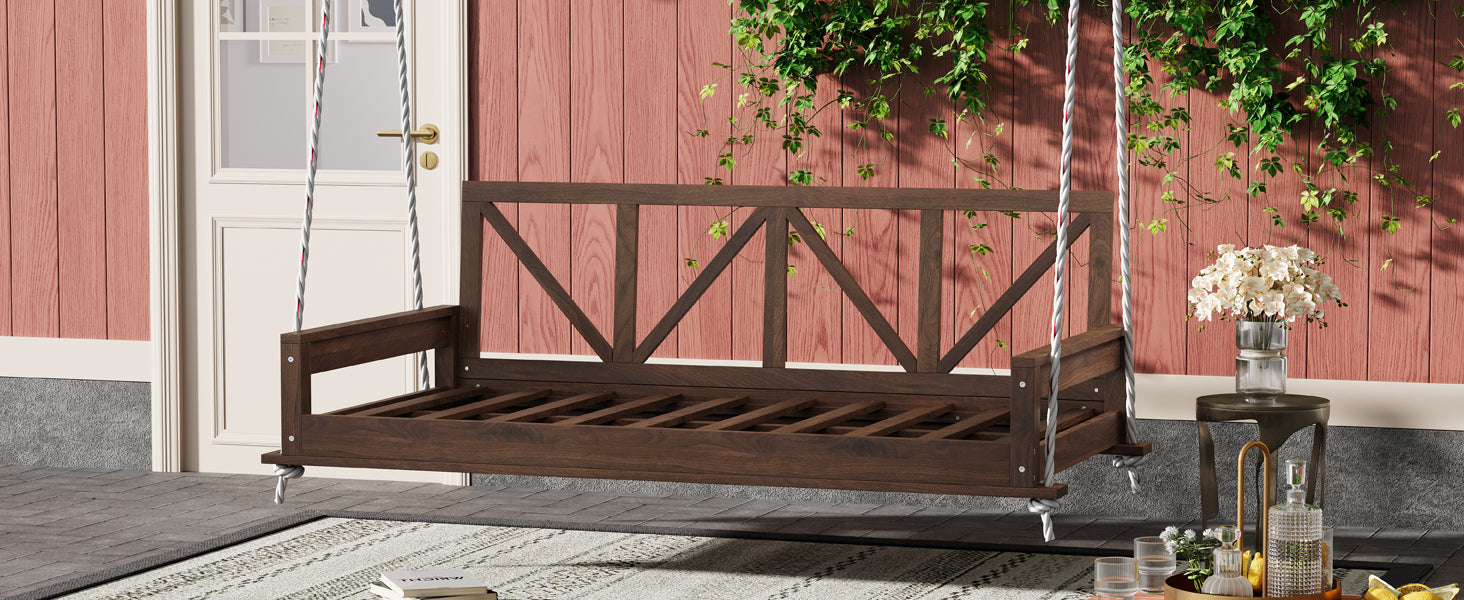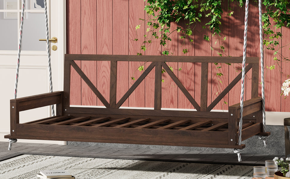 | Summary | Relax in minimalist elegance with this acacia wood twin size swing bed, designed for outdoor spaces like porches, gardens, or covered patios. Its high backrest and dual armrests provide ergonomic support, while 16.4ft hemp ropes allow flexible hanging from beams or sturdy supports. Measuring 85.4”L x 41.5”W, it fits twin mattresses (sold separately) and holds up to 350lbs (safety tested). The weather-resistant acacia frame resists warping and decay, available in 4 different colors to match your décor. Perfect for reading, napping, or stargazing – create a cozy retreat without bulky cushions. Note: Pillows & cushions not included. |