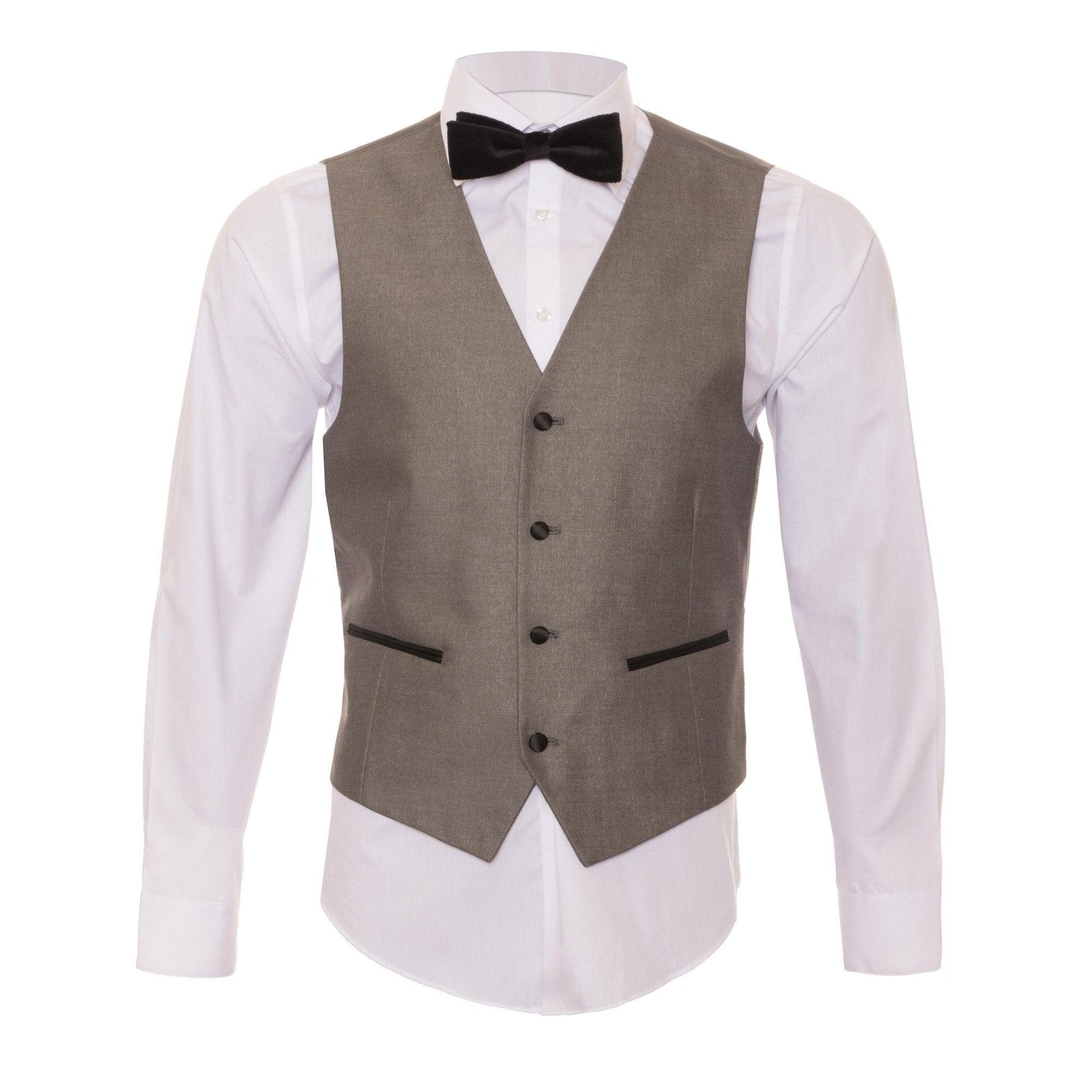 The Celio Grey Black Slim Fit 3 Piece Tuxedo features a Notch Lapel with black trim and a 2 Button Closure with matching 4 button vest. Sophisticated and modern with a rich custom tailored look that is perfect for any formal occasion.