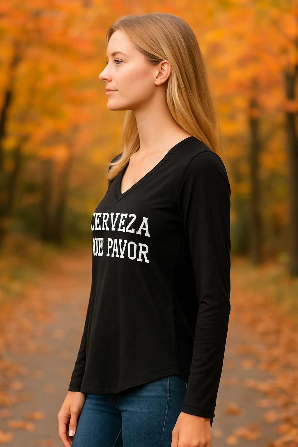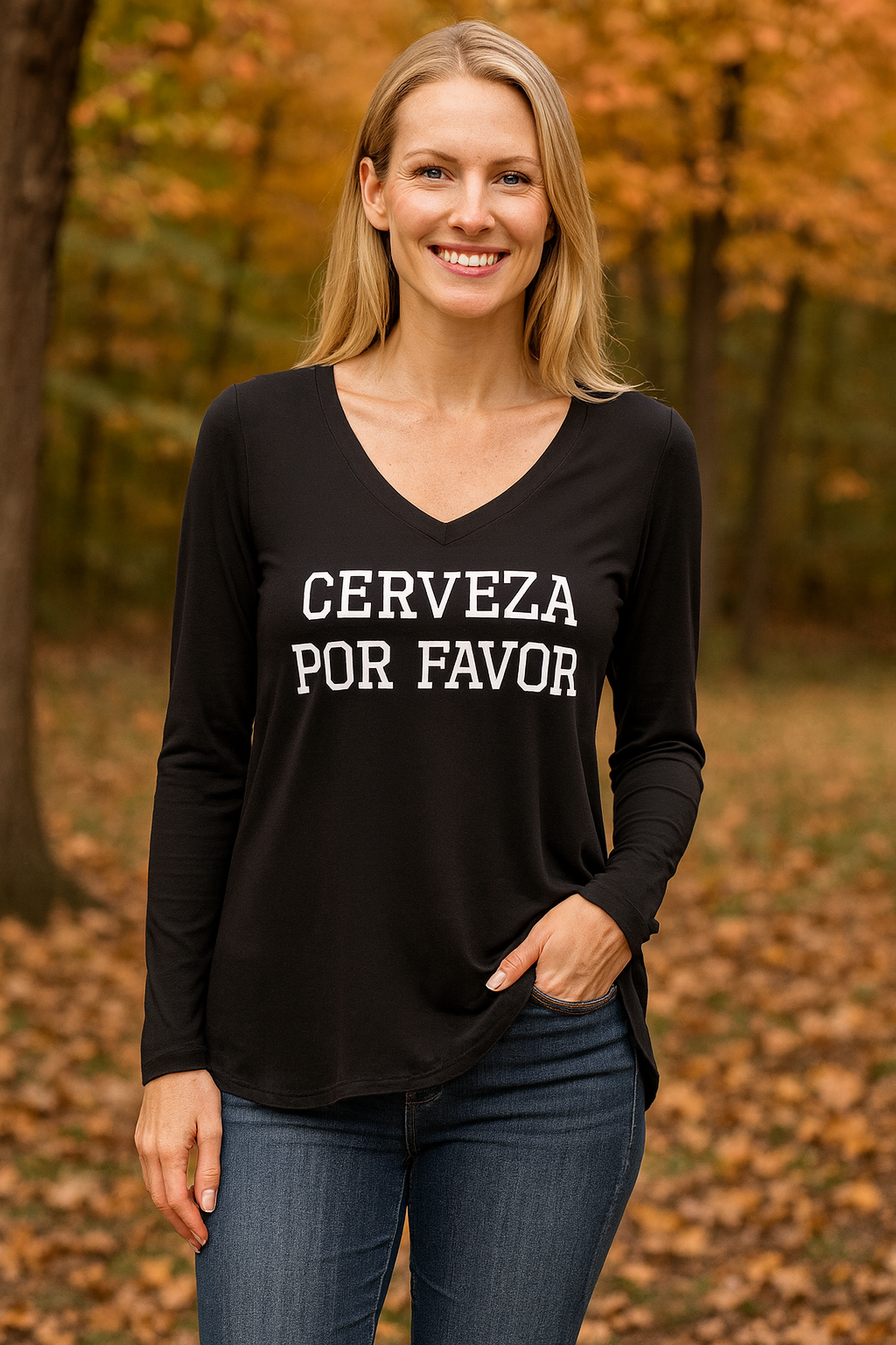 Say it loud (and with style) — Cerveza Por Favor! This playful black long sleeve tee is made from a soft, lightweight fabric with a flattering v-neckline and relaxed fit. Perfect for casual weekends, vacations, or your next taco Tuesday, it pairs effortlessly with jeans, shorts, or leggings.