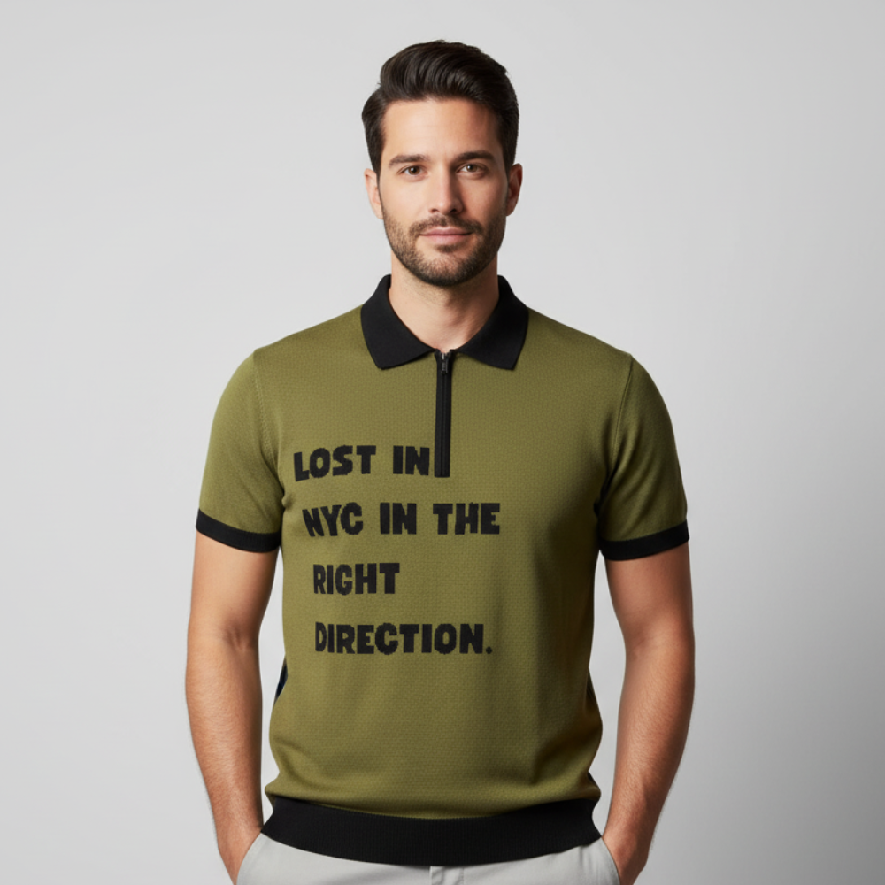 We present the CHELSEA Cashmere Polo, the garment that celebrates the spirit of adventure and self-discovery in the Big Apple. This short-sleeved polo with a half-zip closure features a design in a sophisticated olive green (or khaki) with bold deep black details on the collar, cuffs, and hem. The knit fabric is the canvas for the original and philosophical BYMANYC ® New York phrase: "LOST IN NYC IN THE RIGHT DIRECTION."