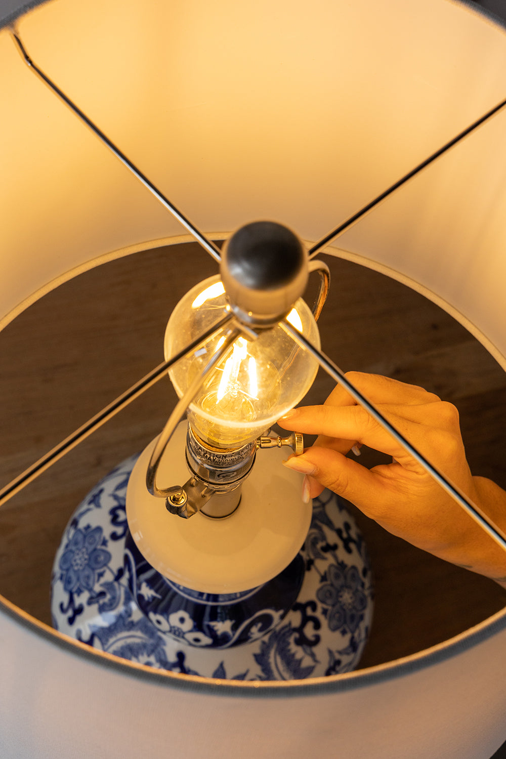 - Boasting a bright, alluring series of blue patterns that dance across the crisp white porcelain, this piece offers the visuals of an accent vase and the warm glow of a table lamp.