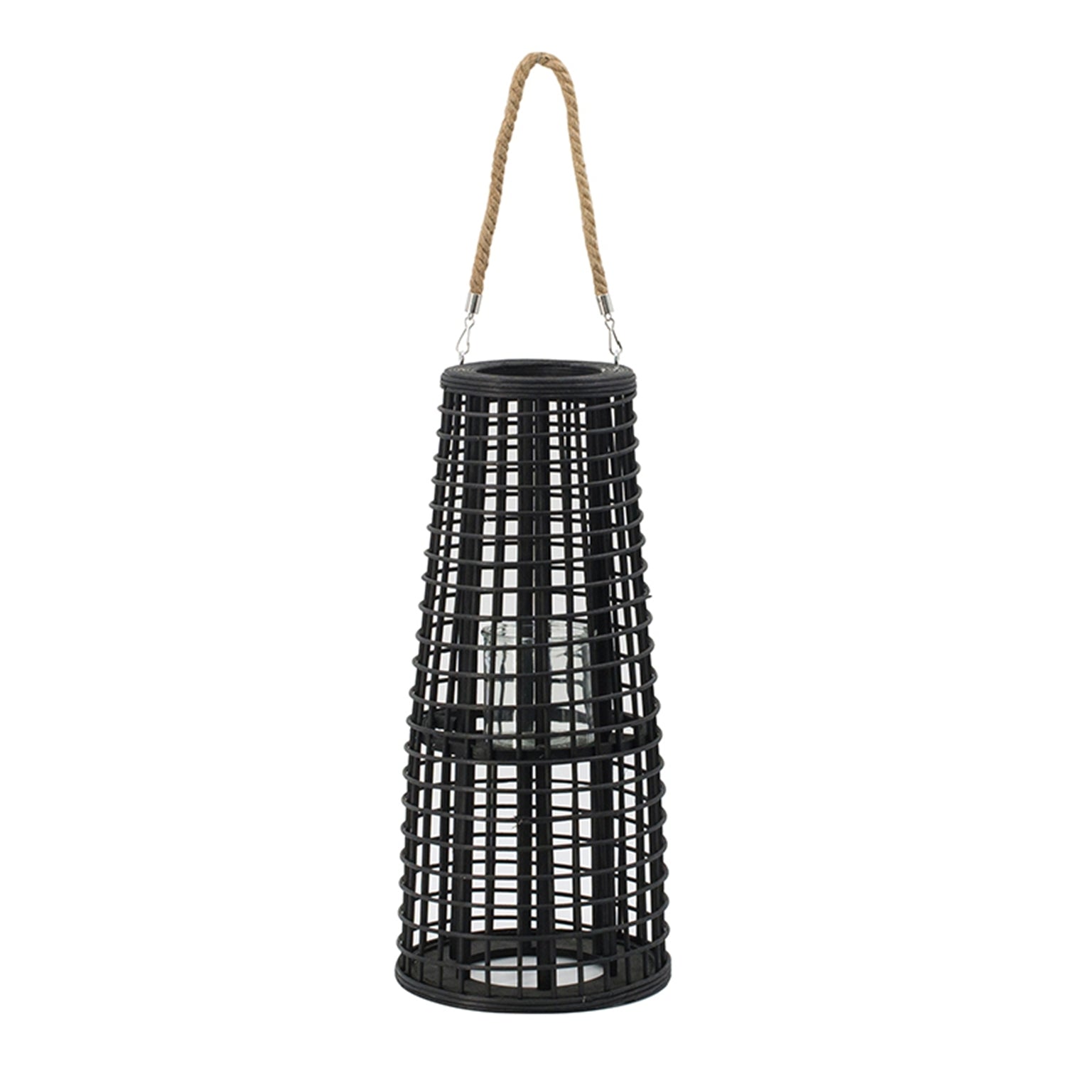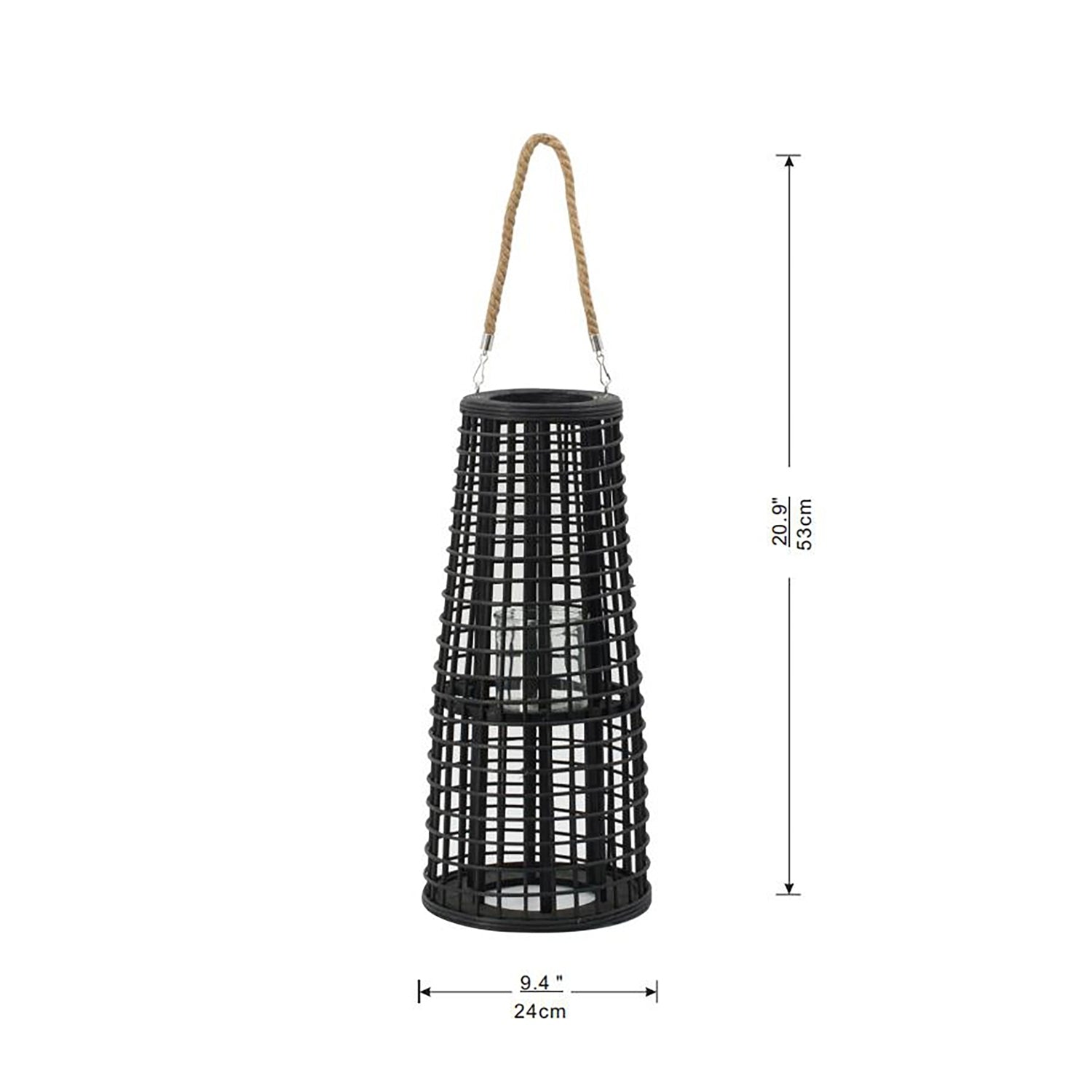 D9.5x21' Woven Rattan Hurricane Lantern With Hemp Rope, Black