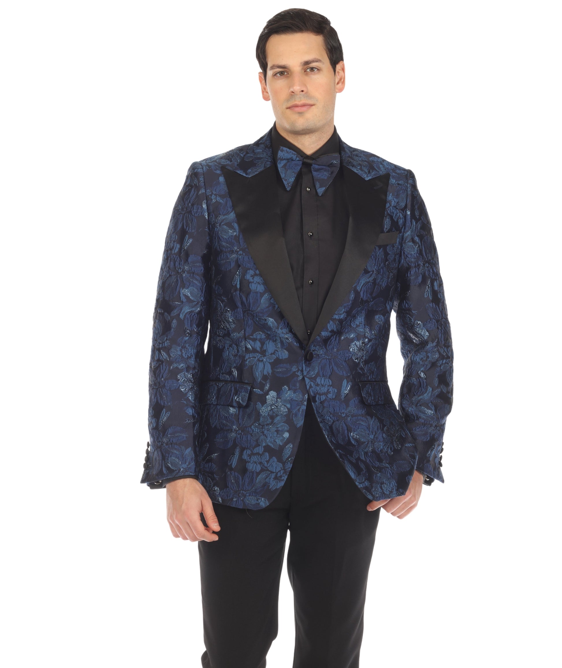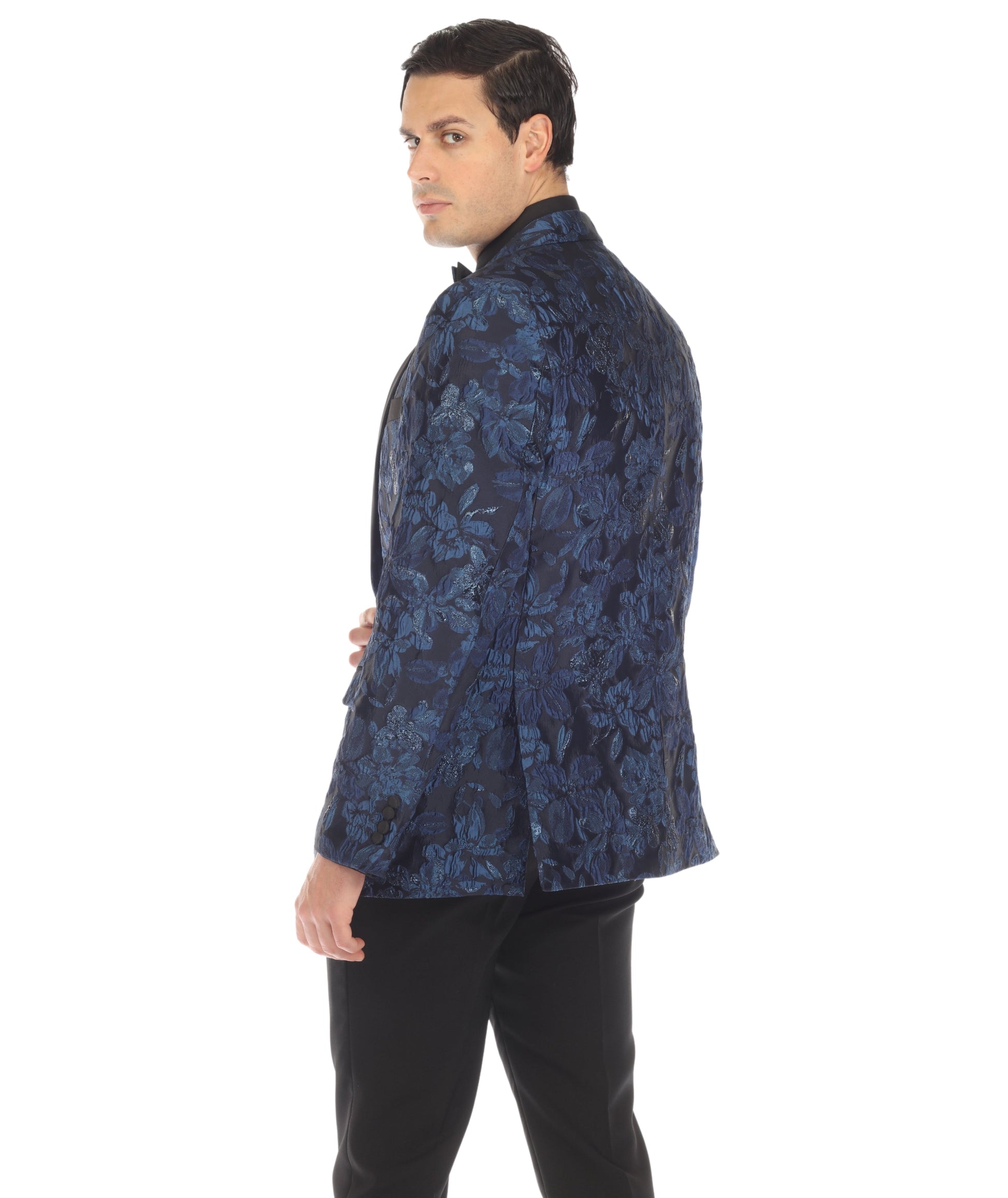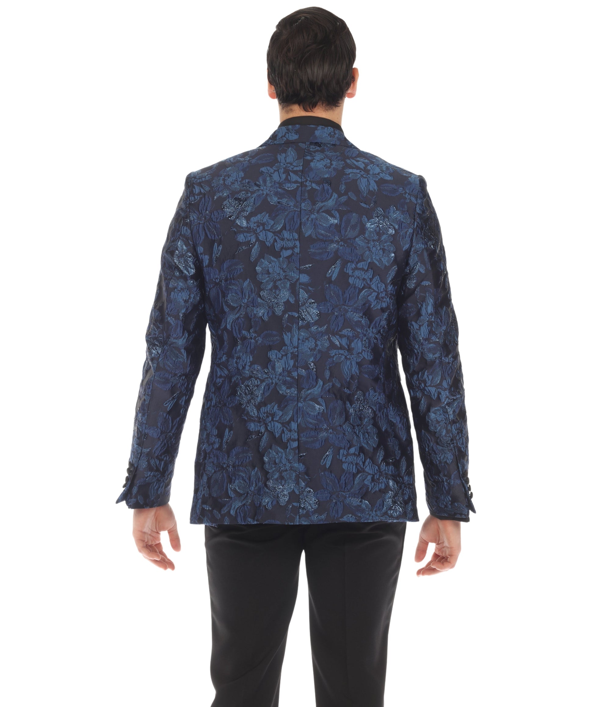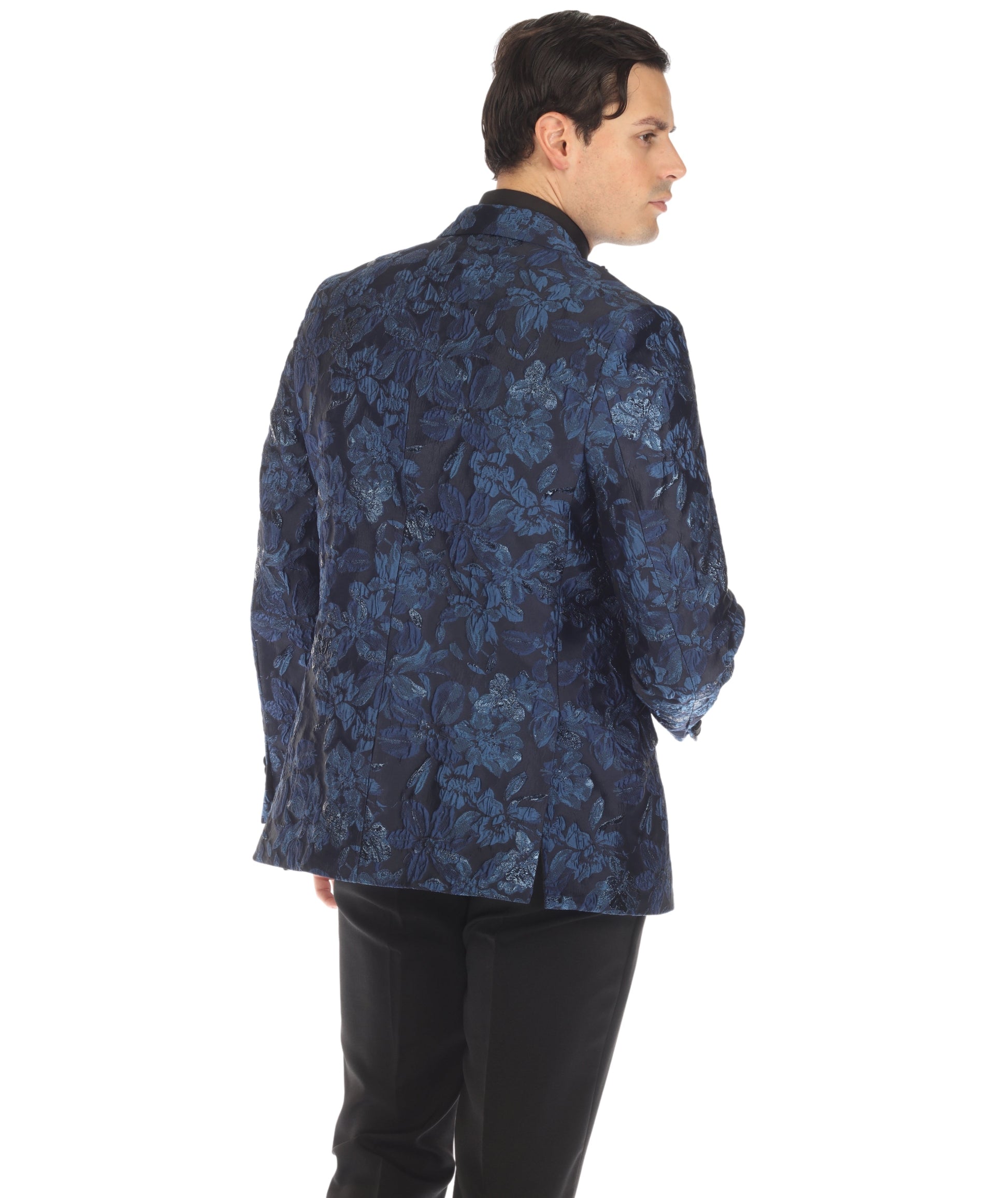 The striking blue hue of the blazer adds a touch of modern flair to the timeless tuxedo style. The peak lapel enhances the jacket's visual appeal, exuding confidence and sophistication.
