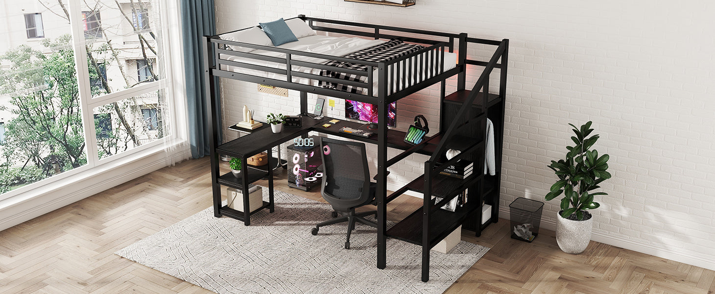 - 【Loft Bed with Storage and Desk】: Our full loft bed frame with desk and storage shelves for kids is great for making extra room in a small bedroom. This functionality loft bed includes a L shape desk and built with 2 shelves under the desk and has 55” of under-bed clearance, the raised base creates a cozy space for storage, study or play to make the most of your space.