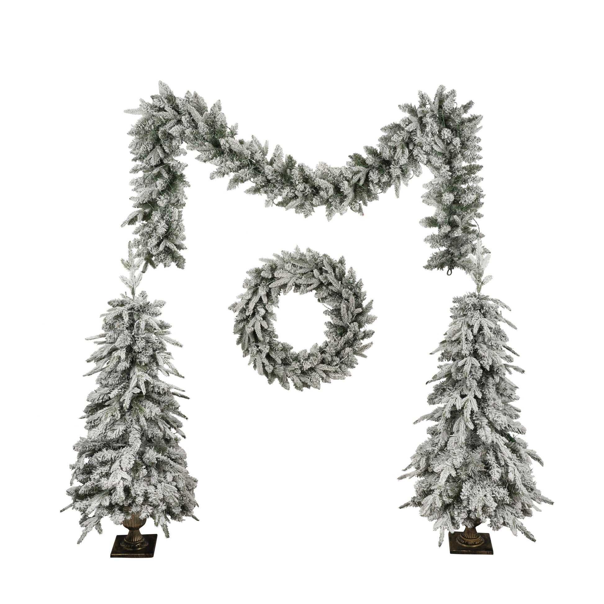 Pre-Lit Christmas Artificial Tree 4-Piece Set, Garland, Wreath and Set of 2 Entrance Trees, X-Mas With LED Lights, PVC F