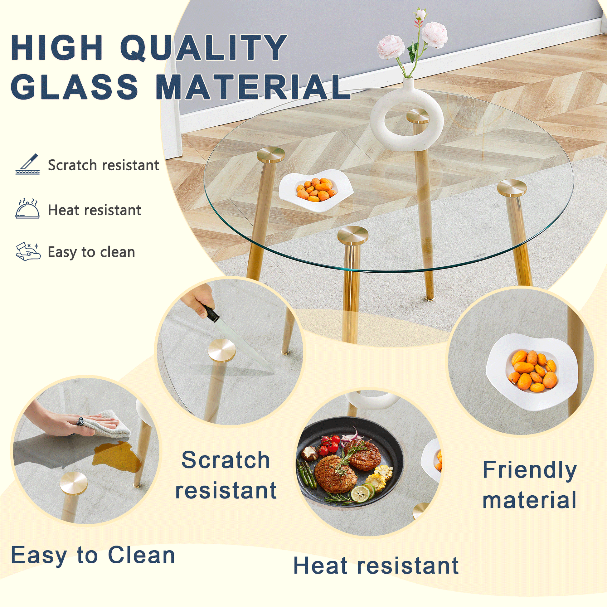 - Transparent glass table complements white-gold chairs, seamlessly blending into industrial, or minimalist interiors.Table Main Material:Tempered Glass + Metal Frame.Clear Tempered Glass: The 39.7-inch round tabletop is made of clear tempered glass, with smooth edges, providing a clear view while ensuring dining safety.