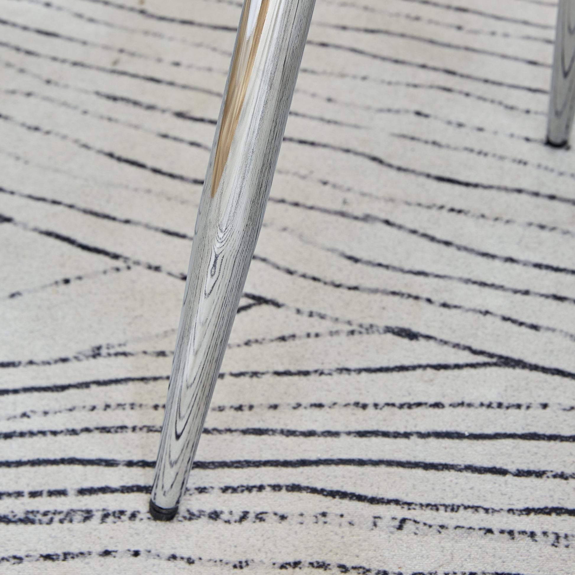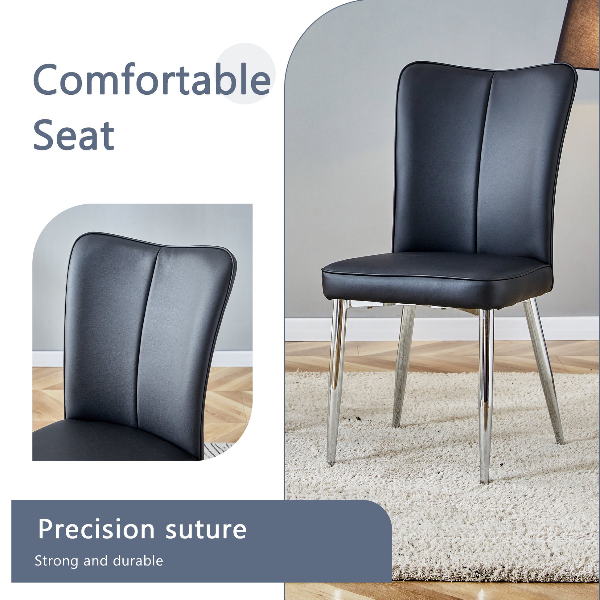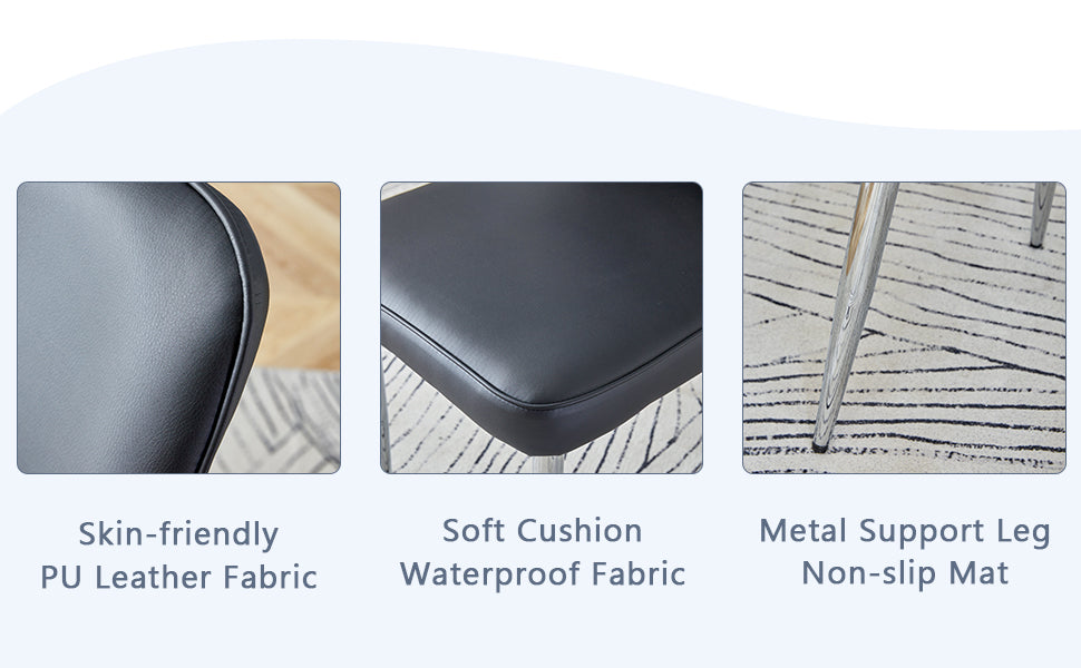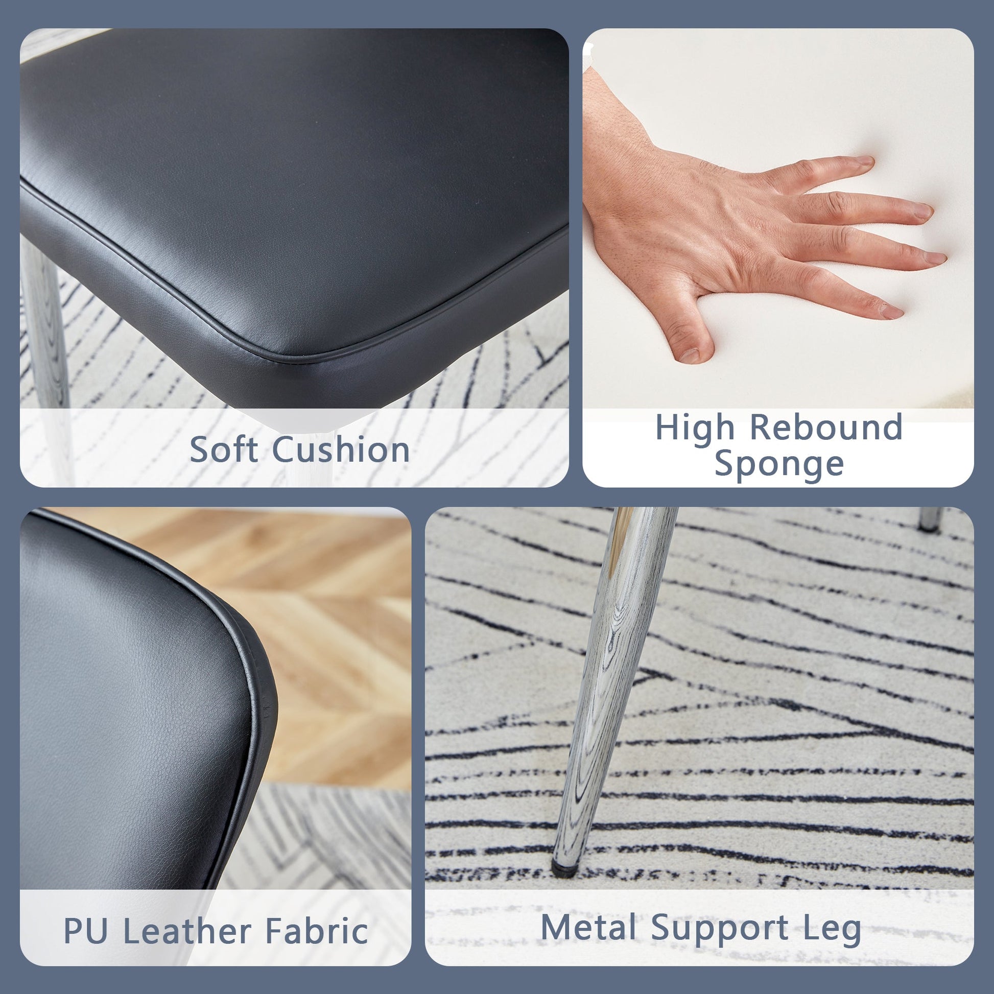 - PU Material for Comfort: The chairs are made of PU material, with a vertical line design on the backrest that adds aesthetic detail while offering a soft and comfortable seating experience.Silver Metal Chair Legs: The silver metal legs of the chairs echo the table legs, creating a coordinated and unified look that showcases the refinement and fashion of modern home furnishings.