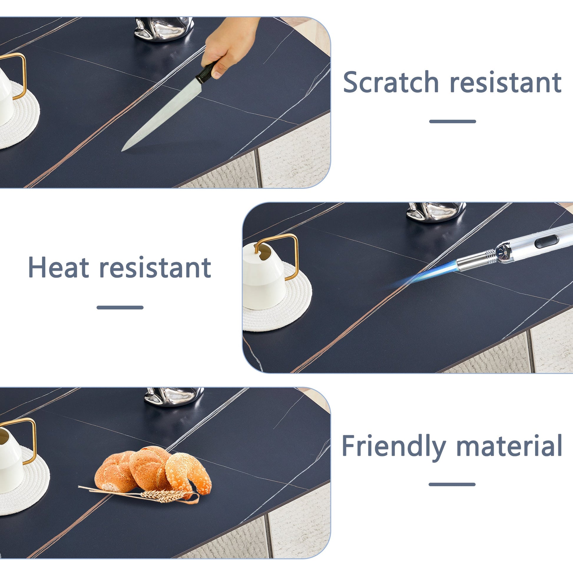 - Premium Slab Table Top: Made of durable slab material with a black marble pattern, bringing a high-end texture to your dining area.Scratch and Heat Resistant: The tabletop is designed to be scratch and heat resistant, suitable for placing hot dishes, and easy for daily maintenance.