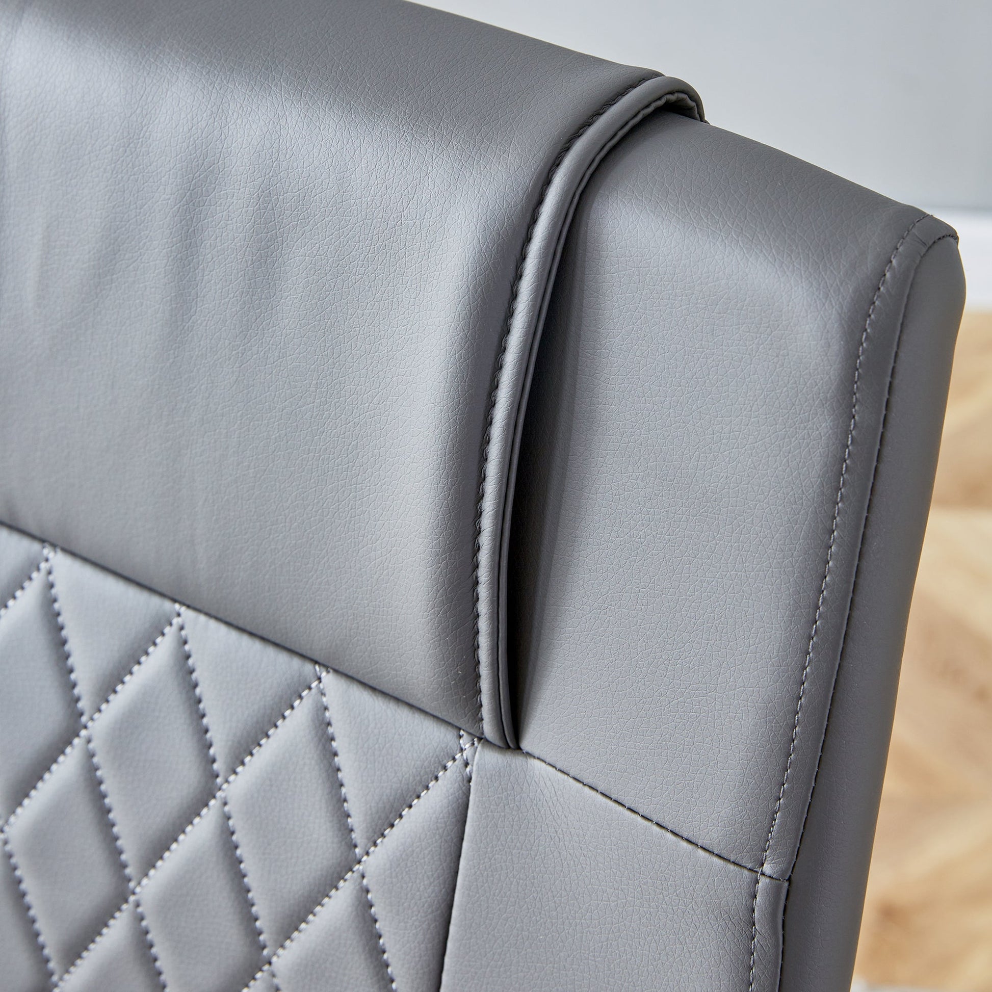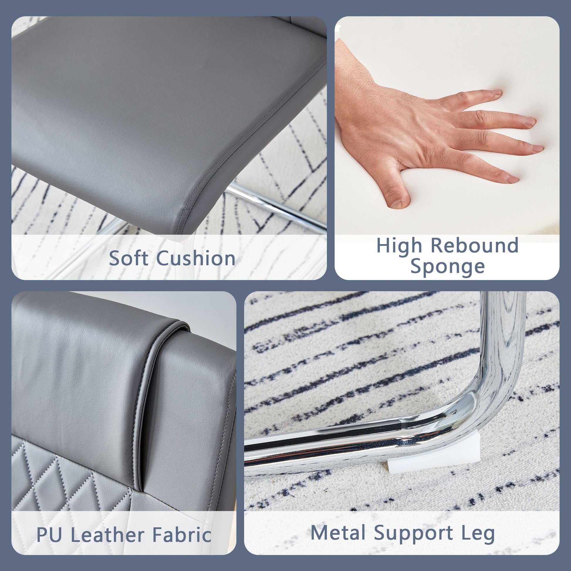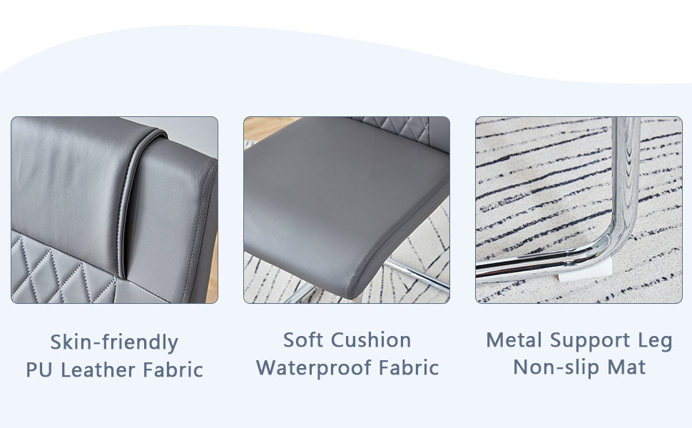 - Dark gray Grid PU Backrest: The backrest and seat cushions of the dining chairs are made of PU material with grid patterns on backrest, enhancing the aesthetics and comfort of the seats, while being easy to clean and maintain.Sponge filled backrest: The backrest is filled with sponge, providing soft and comfortable support.Anti slip foot design: The bottom of the chair legs is equipped with anti slip feet to protect the floor and increase safety during use.