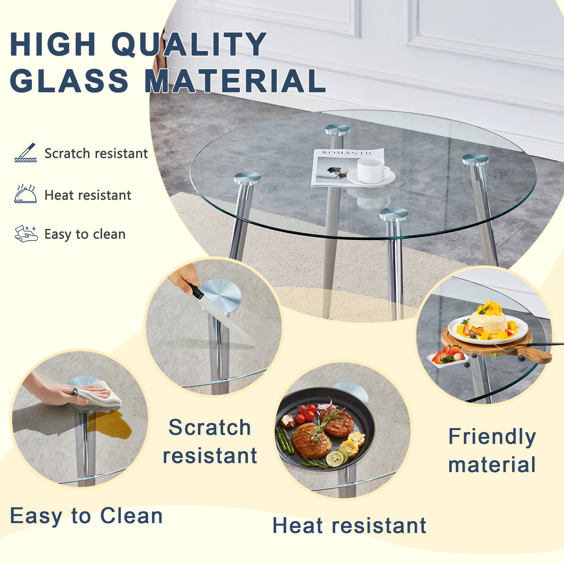 - The characteristic of this table is a glass tabletop, with four silver plated metal legs, and a clean interior design that adds a fashionable style.The non-slip rubber pads on the table legs offer greater stability and avoid scratching the floor.