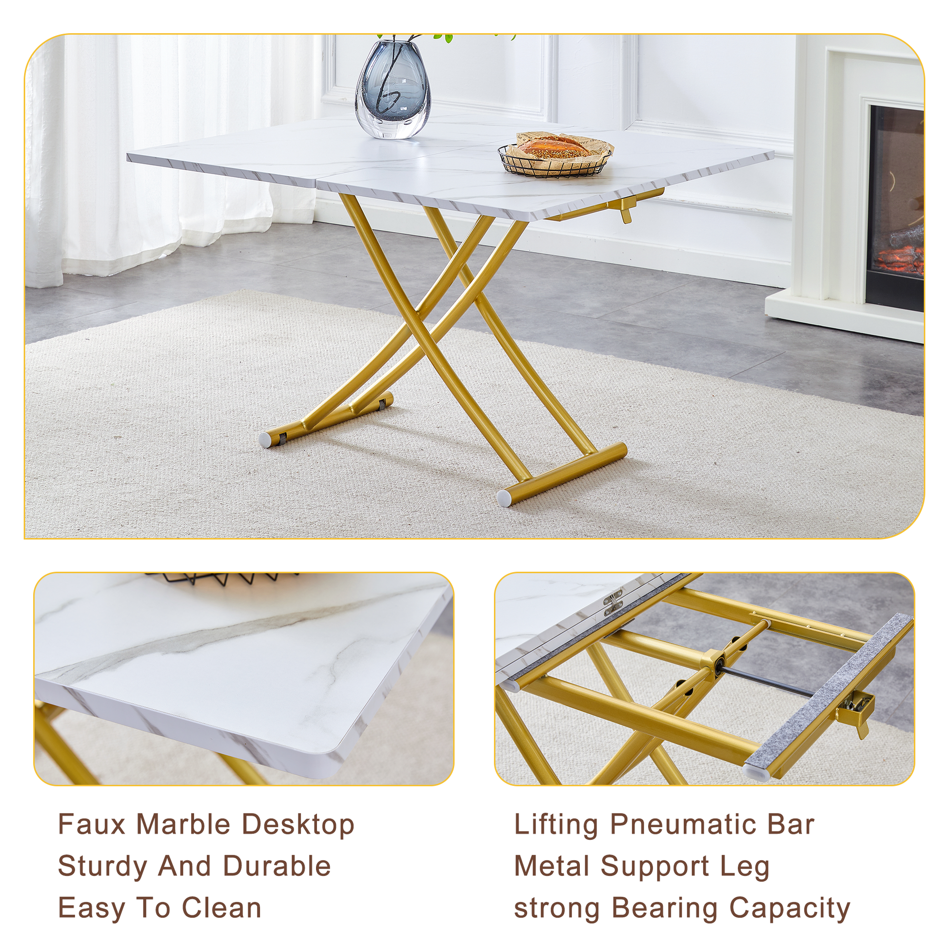 - Modern minimalist multifunctional lift table with 0.8 inch thick MDF desktop and golden metal legs.The table legs can be adjusted from 18.3 inches to 29 inches in height.