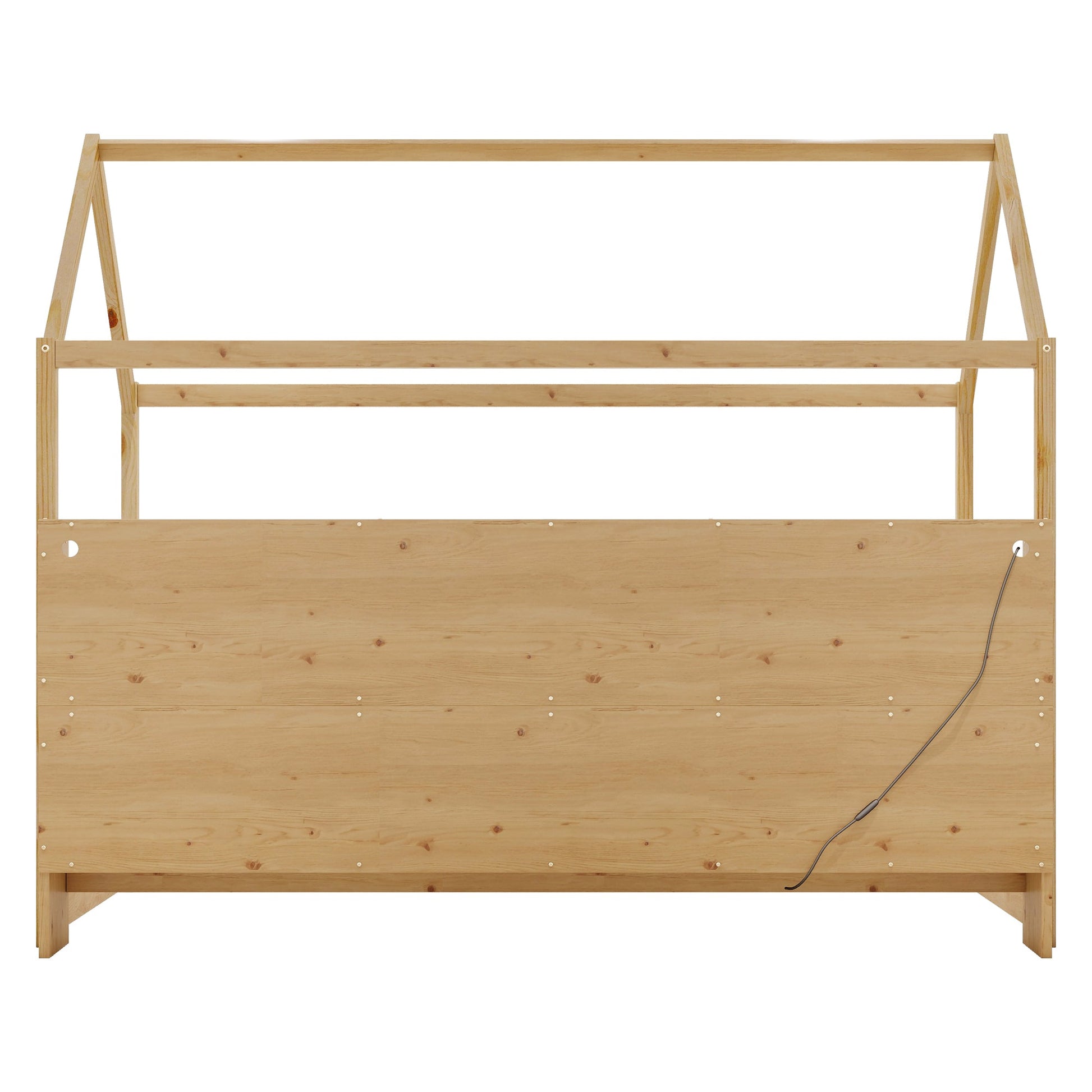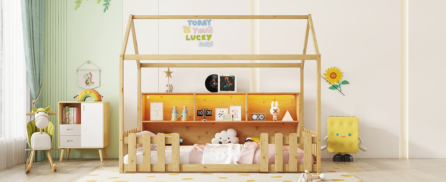 This twin size house bed comes with roof, house shape which can inspire your kid's imagination, you can decorate the bed as your kid's personal playground with your kid. The LED light make your kids more safe at night. The bookshelf provide large storage. The fence provides a sense of rural life and guarantees safety of the young user.