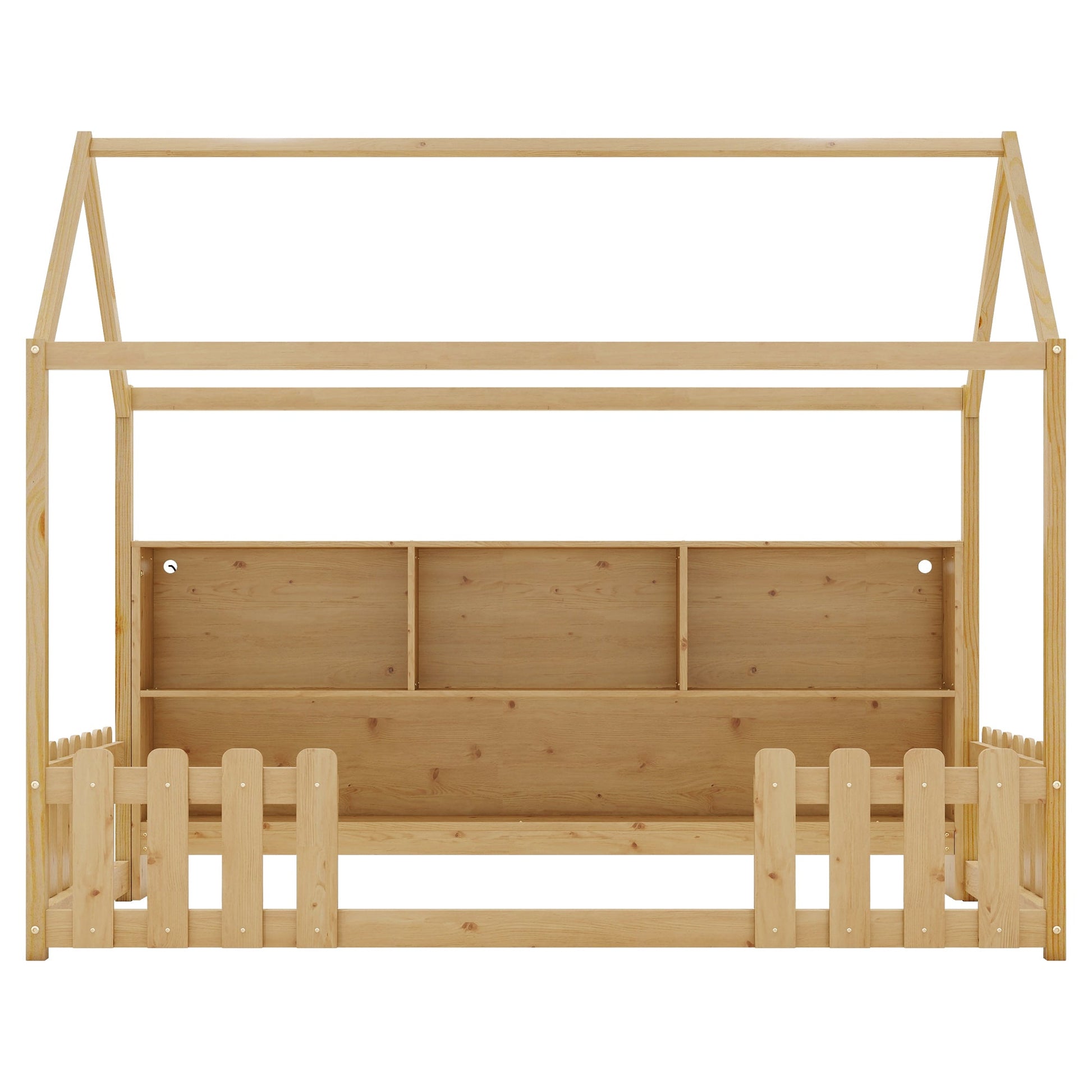 Twin Size House Bed With LED Light, Wood House Bed With Storage Bookshelf, Floor House Bed With Guardrails for Kids, Nat
