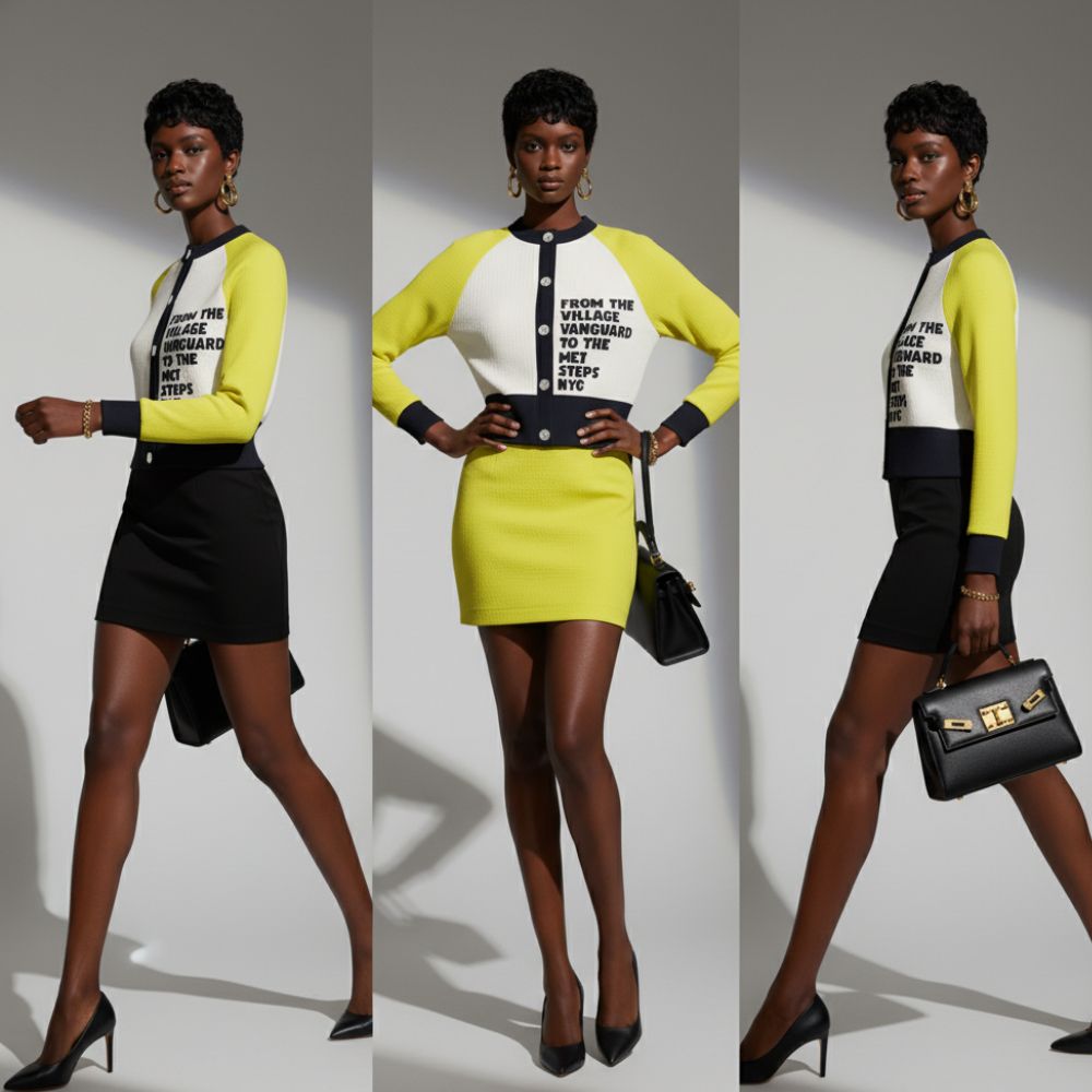 We present the VANGUARD Jacket, the garment that weaves the iconic culture of New York into a single piece. This cropped, cardigan-style jacket, featuring a color-block design, combines off-white and bright taxi yellow, with a round neck and cuffs in deep black. It carries the inspiring and original BYMANYC® New York phrase: "FROM THE VILLAGE VANGUARD TO THE MET STEPS NYC".