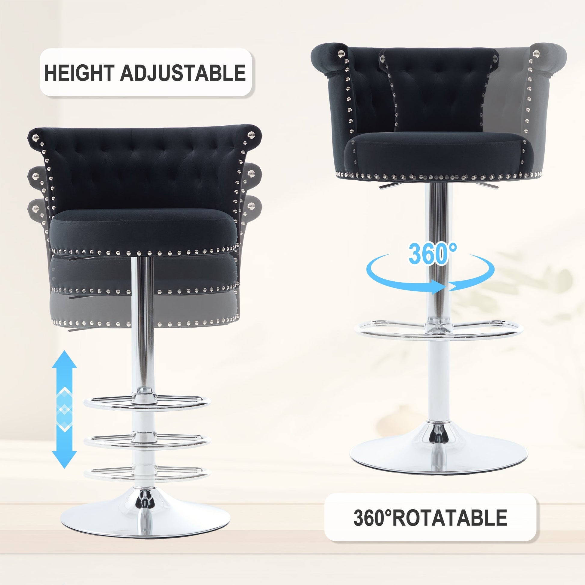 The bar stools have a height adjustable function that can adjust to your most comfortable height according to the bar height. The bar stool also comes with a footrest and has a 360°swivel role, allowing you to relax your body and communicate more easily during casual conversation.